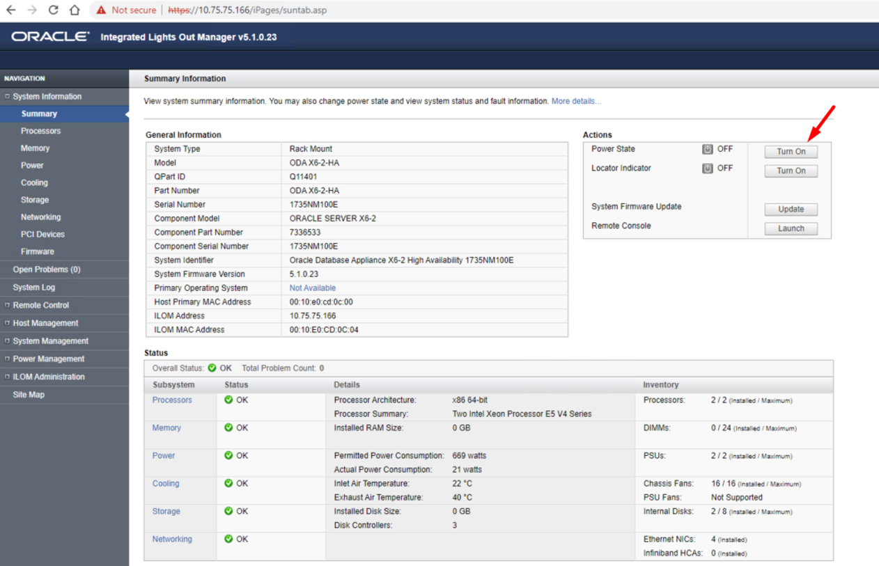 In de ILOM wordt aangegeven dat de machine ge-reboot wordt. Na het rebooten van de ILOM staat de database node uit en moet deze via de ILOM aangezet worden. Je ziet dan ook dat de versie van de ILOM veranderd is t.o.v. de vorige screenshots.