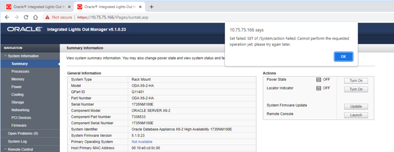Als geprobeerd wordt om de database server te vroeg aan te zetten, komt de ILOM met een melding