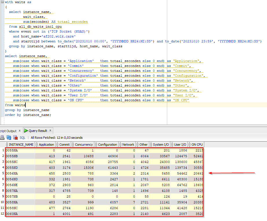 Nadat alle .csv files verzameld en verwerkt zijn bevat tabel all_db_waits_incl_cpu voor alle instances per databaseserver de informatie over wait events en CPU gebruik.